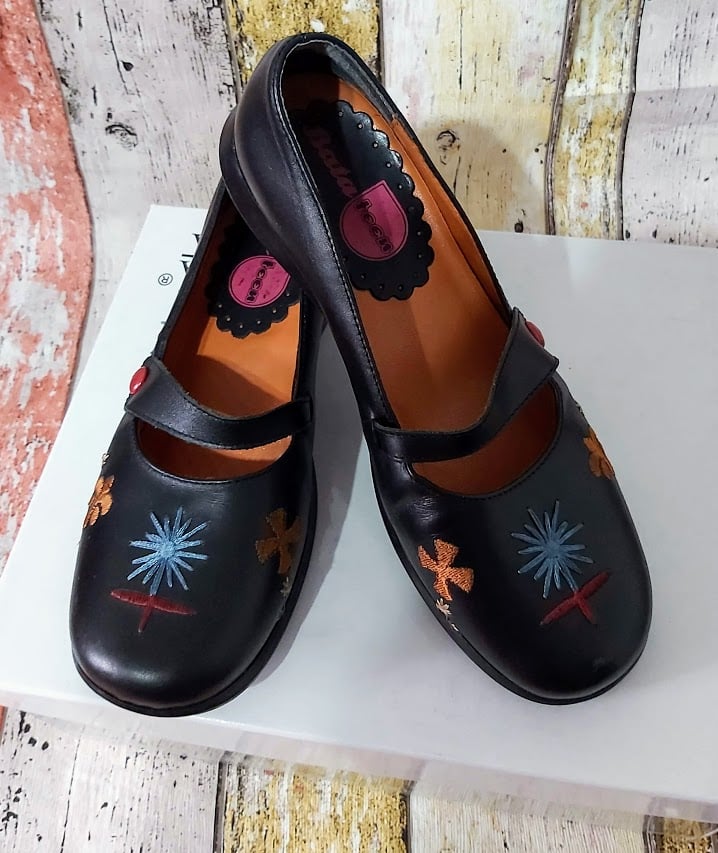 Pantofi Bata din piele naturala interior-exterior cu motive etnice brodate,talpa joasa,comoda,mas 38[25-25,2cm interior talpa].Stare noi.