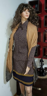 Realizat din bumbac crepon cu partea de bluza model ce se termina in colt mai lung fata-spate,inchidere in nasturei.Fusta are poale usor asimetrice si este dublata cu panza de bbc pe dedesubt iar talia este din elastece multiple.In talie are cordon tip esarfa prins intr-o catarama mare de cocos.Mas universala dar recomand mas S,M,L