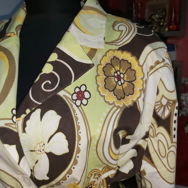Jacheta din bumbac retro cu flori stilizate, conturate cu auriu desprinse parca dintr-o pictura. Croiala anilor 80 cu mici despicaturi usor pe lateral . Se inchide in fata cu nasturi aurii.,maneca 3/4