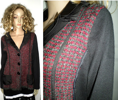 Fusta in croi drept cu slit decent la spate, talie pe elastic tip jartea: talie 74-84 cm, sold 106 cm, lungime 65 cm. Bluza-sacou model petrecut cu revere puse in evidenta de combinatia cu material de culoare neagra, nasturii sunt minunati, au exact forma unei flori, croi foarte elegant cu peplum din talie (inca la moda), la mijlocul spatelui are o portiune cu tighele elastice care il aseaza f. frumos pe talie, la partea finala a manecutelor care sunt usor bufante este aplicata cate o fundita neagra f. draguta, care ii confera un sic aparte: umeri 40 cm, bust ppana la 106 cm, talie 82-86 cm, sold oricat, lejer, lungime 60 cm. Este absolut incantator, modelul peplum pe 2 randuri nu mareste soldurile ci dimpotriva, talia este pusa in evidenta si pare mai subtire intrucat este strans pe talie iar volanasele peplum stau usor ridicate, cu o lina cadere in falduri. Este superb. Aspect de nou[nu cred ca a fost utilizat] cu nasture floricica de rezerva.88LEI |